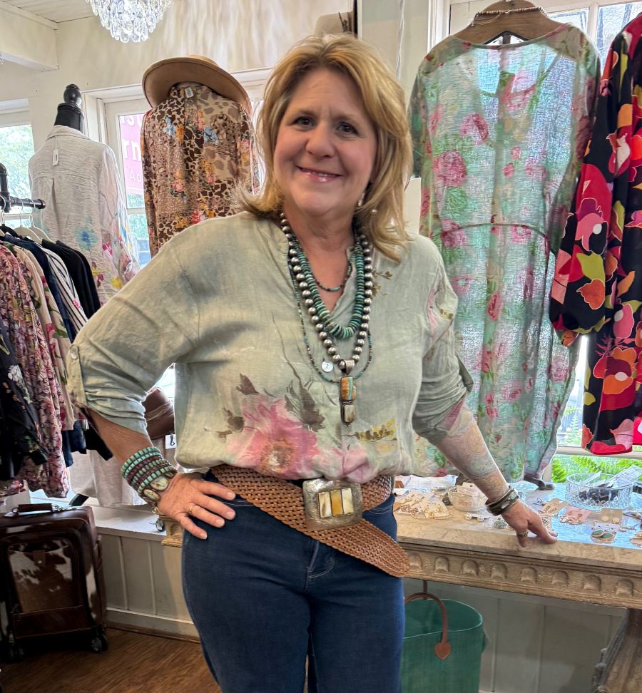 Italian linen top one-size-fits most has a beautiful pink floral design on the front and back. Its 3/4 length sleeves make it versatile for any season. One -size fits most ranges from 4-14, it can be worn tucked in or left out.
