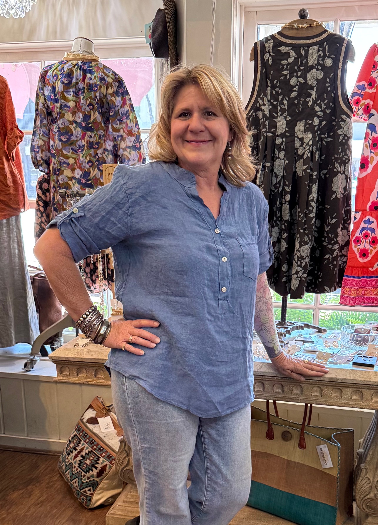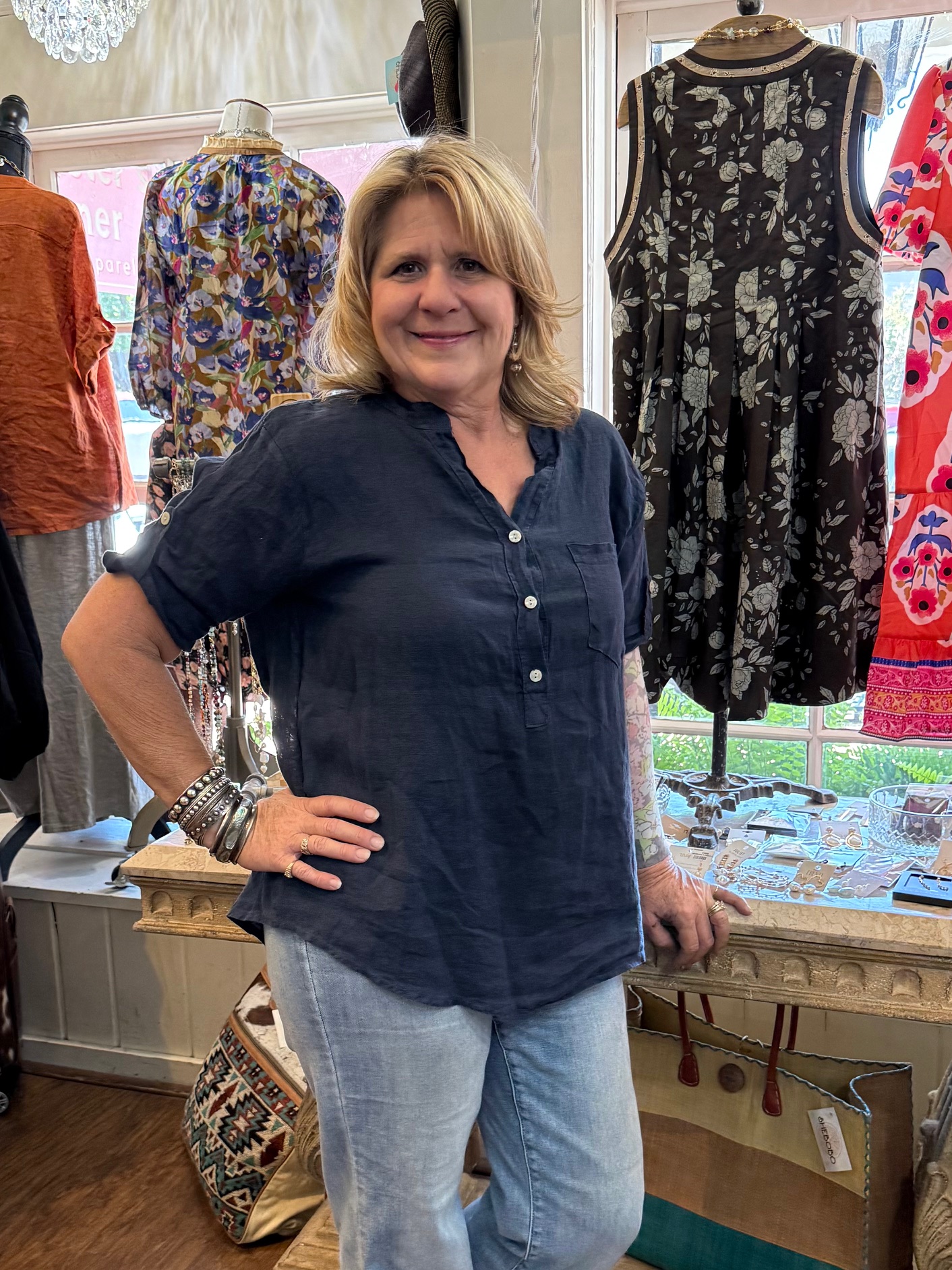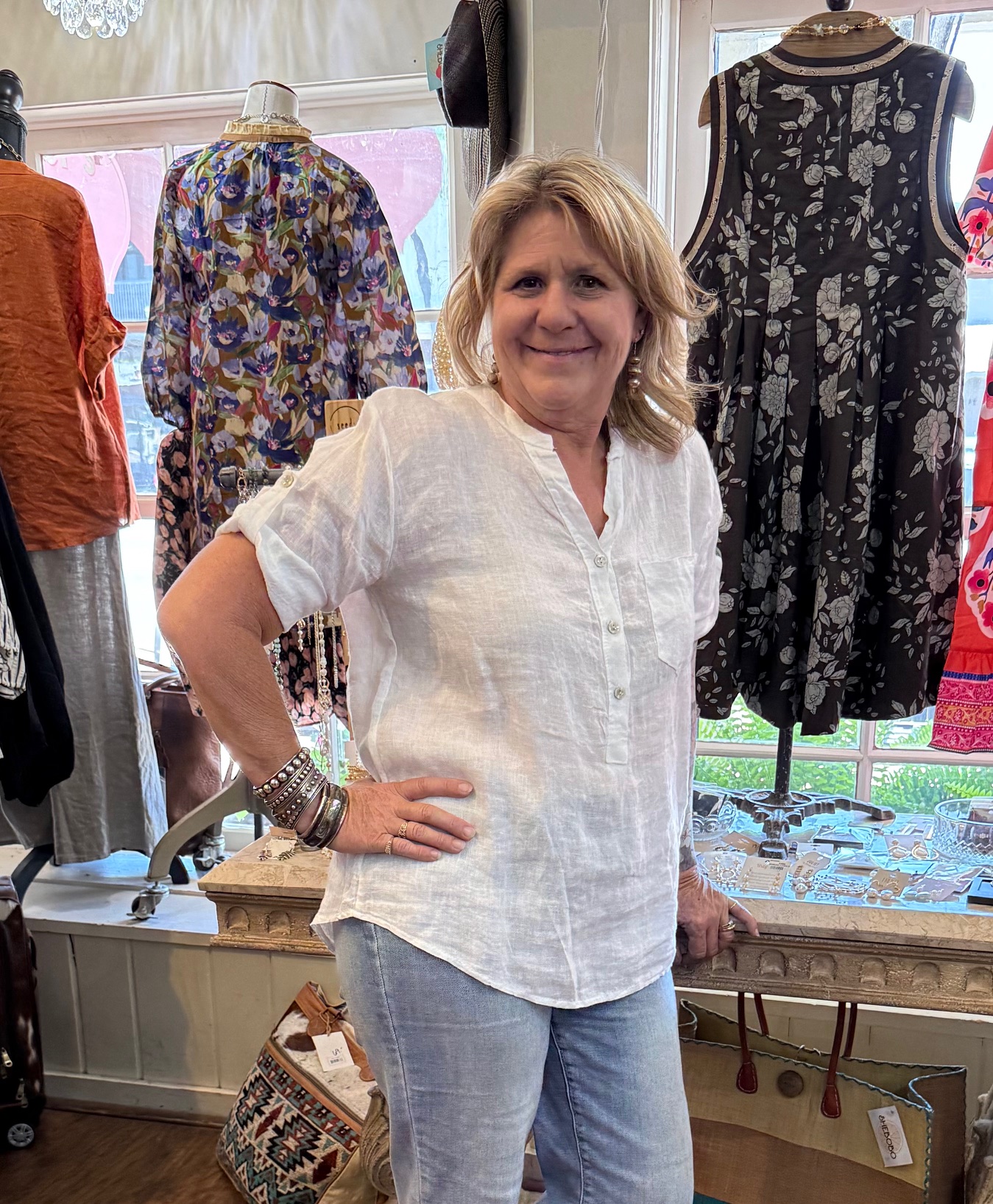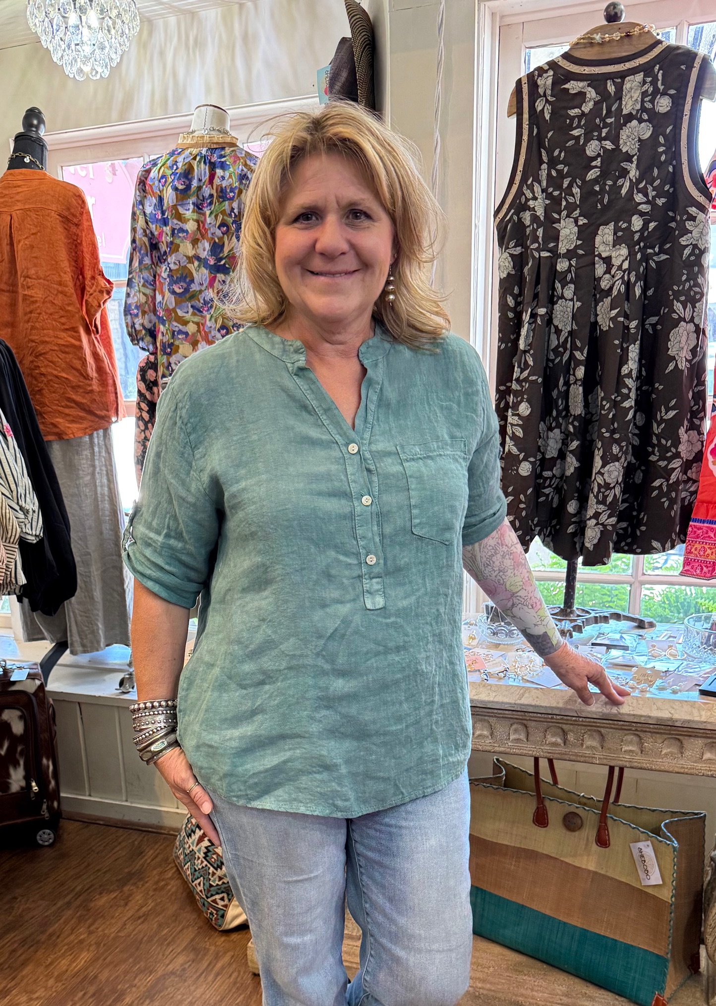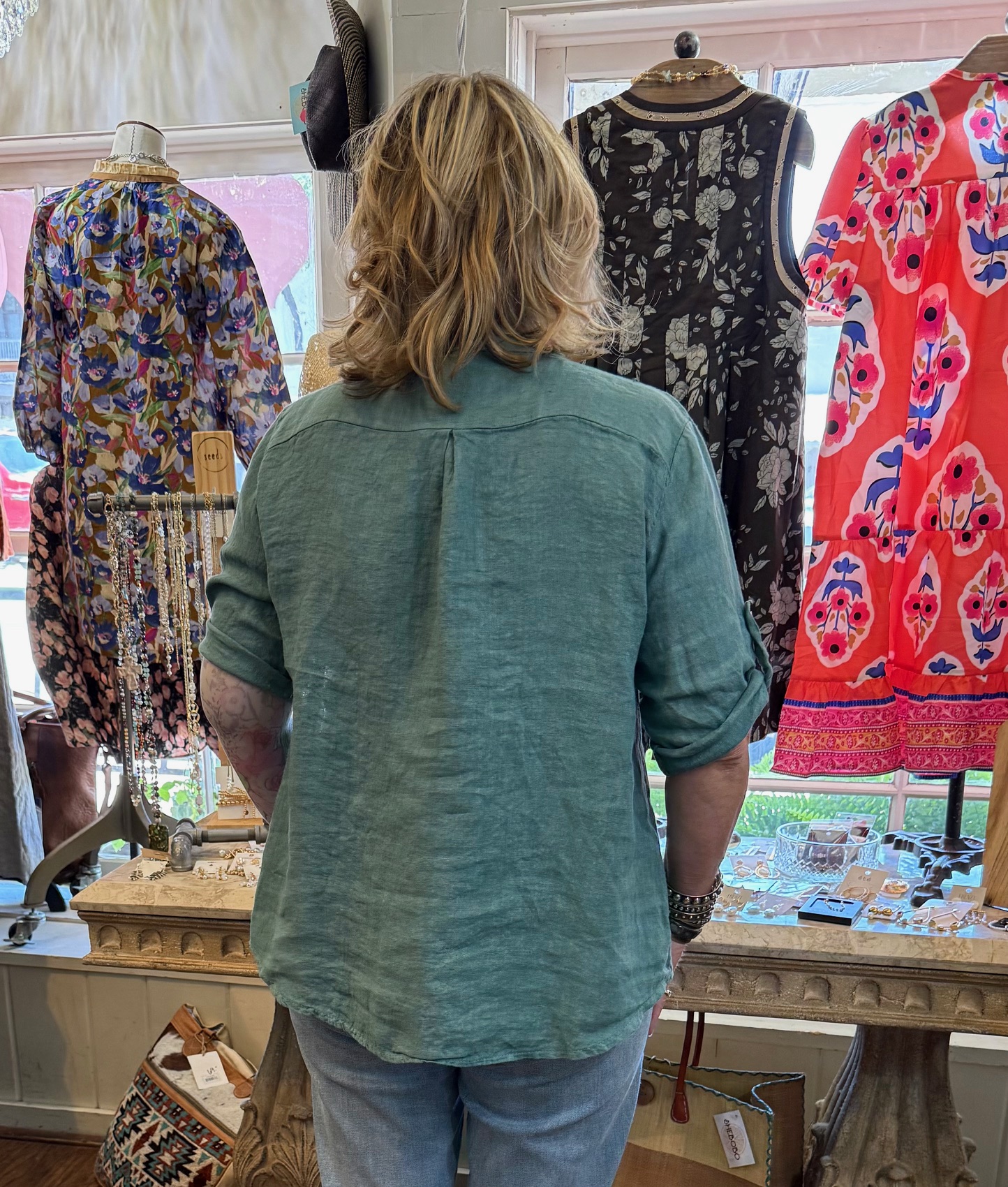 Crafted from premium Italian linen, this solid-color top is the perfect blend of comfort and sophistication. Featuring a flattering V-neckline with a minimalist preacher collar, it offers a modern twist on a timeless silhouette. The 3/4 length sleeves can be worn down or rolled up and secured with a button-tab closure, giving you versatile style options for any occasion. Finished with a single front pocket for a subtle touch of utility, this top is breathable, lightweight, and ideal for warm-weather days or layering year-round.