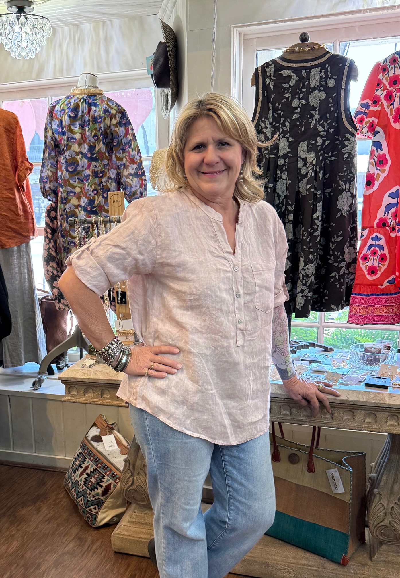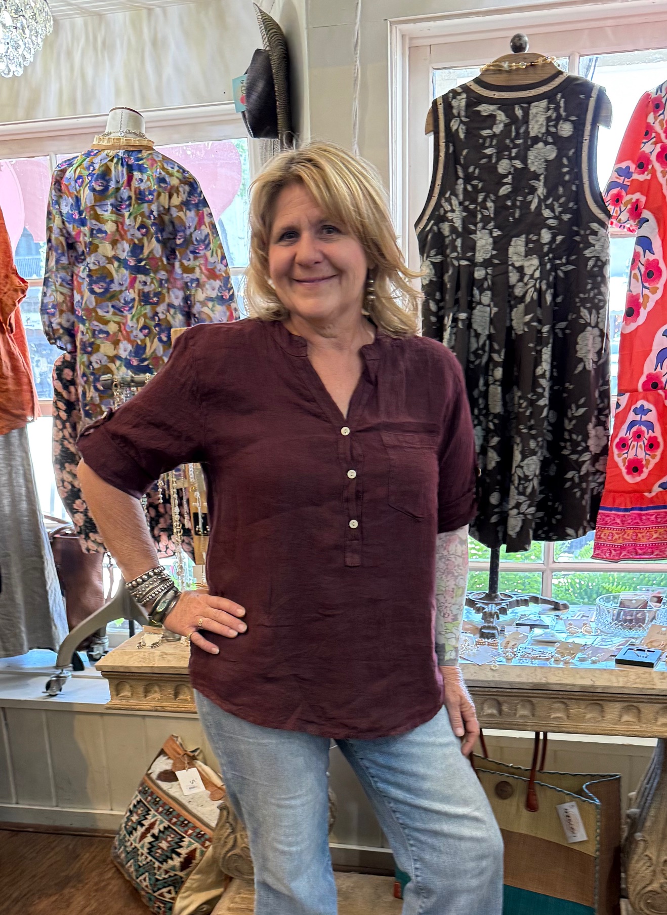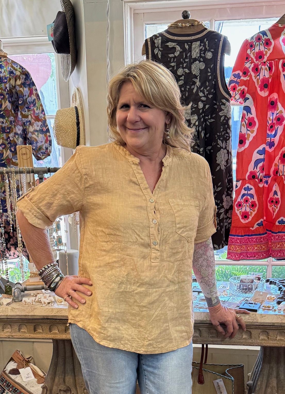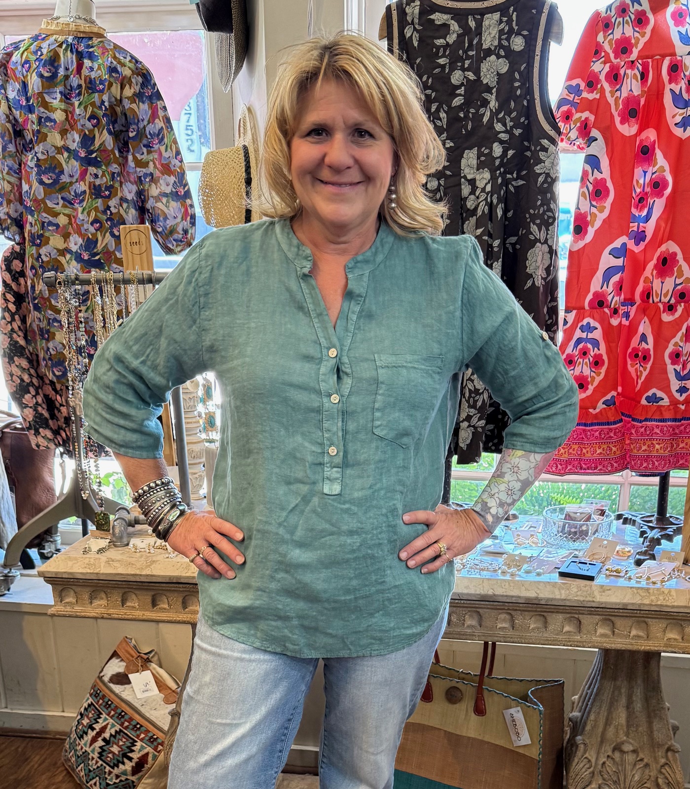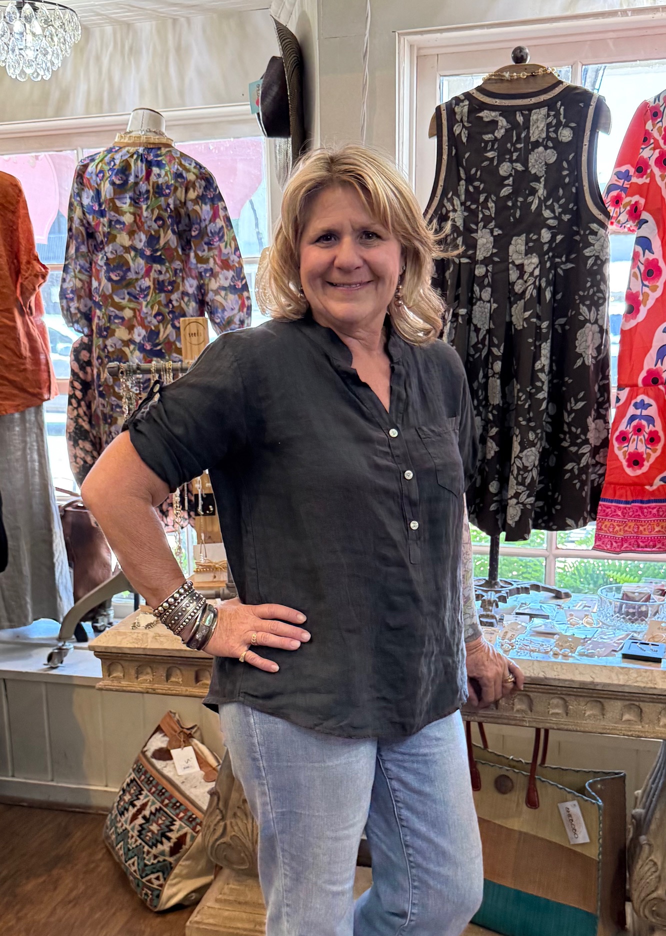 Crafted from premium Italian linen, this solid-color top is the perfect blend of comfort and sophistication. Featuring a flattering V-neckline with a minimalist preacher collar, it offers a modern twist on a timeless silhouette. The 3/4 length sleeves can be worn down or rolled up and secured with a button-tab closure, giving you versatile style options for any occasion. Finished with a single front pocket for a subtle touch of utility, this top is breathable, lightweight, and ideal for warm-weather days or layering year-round.
