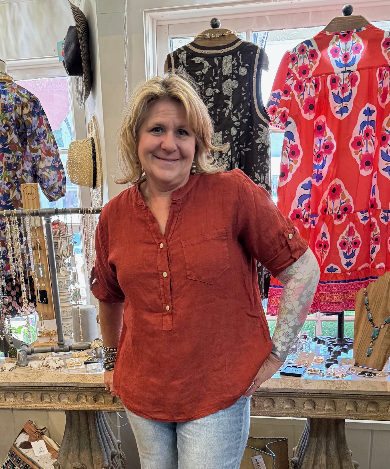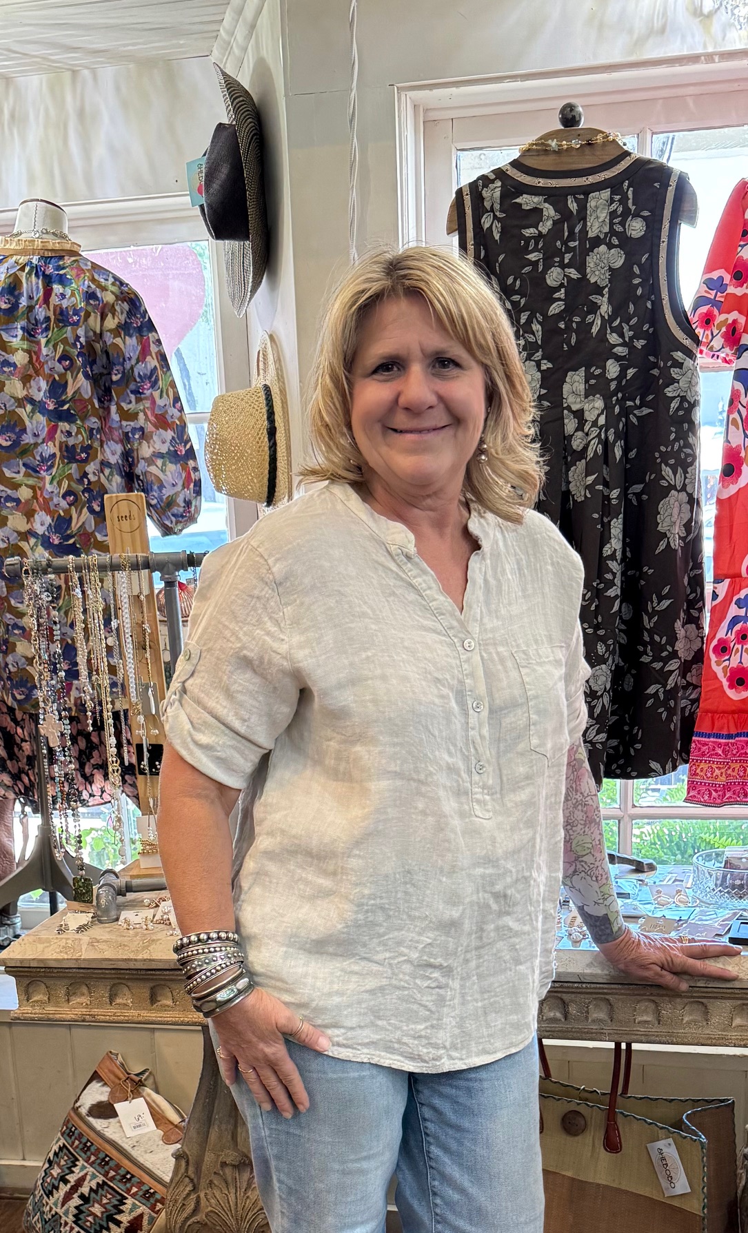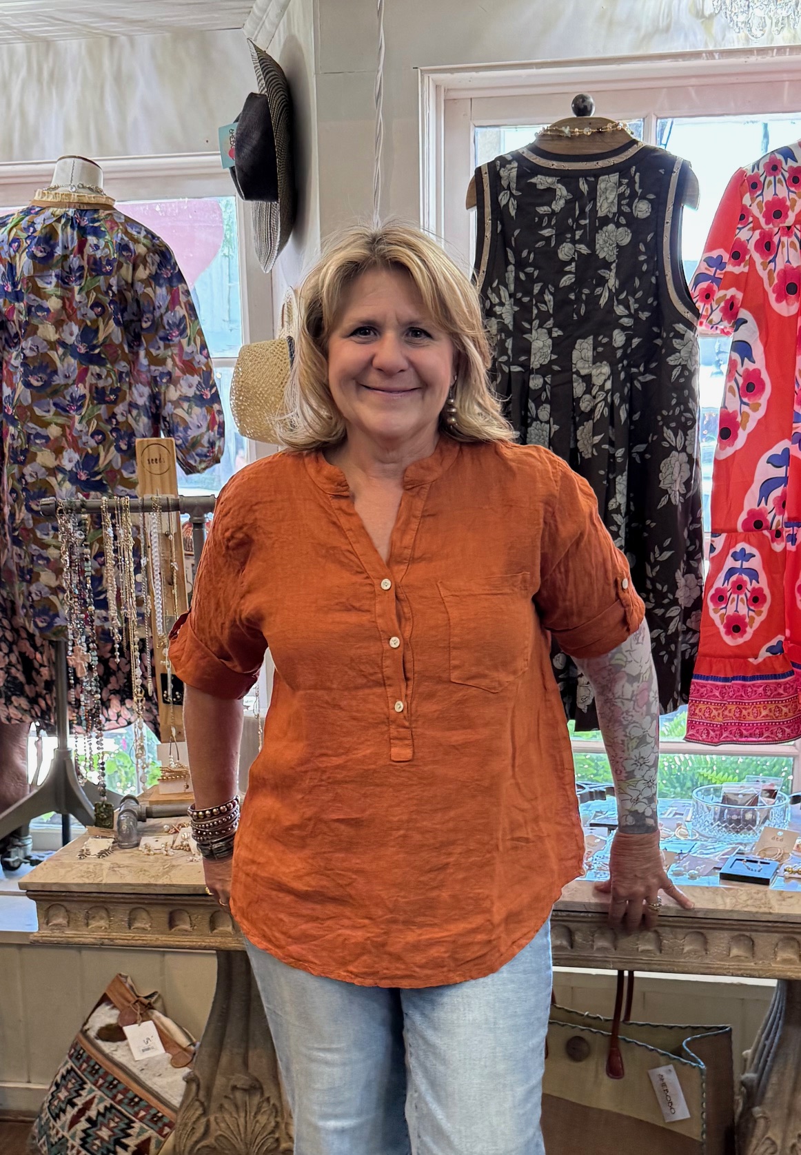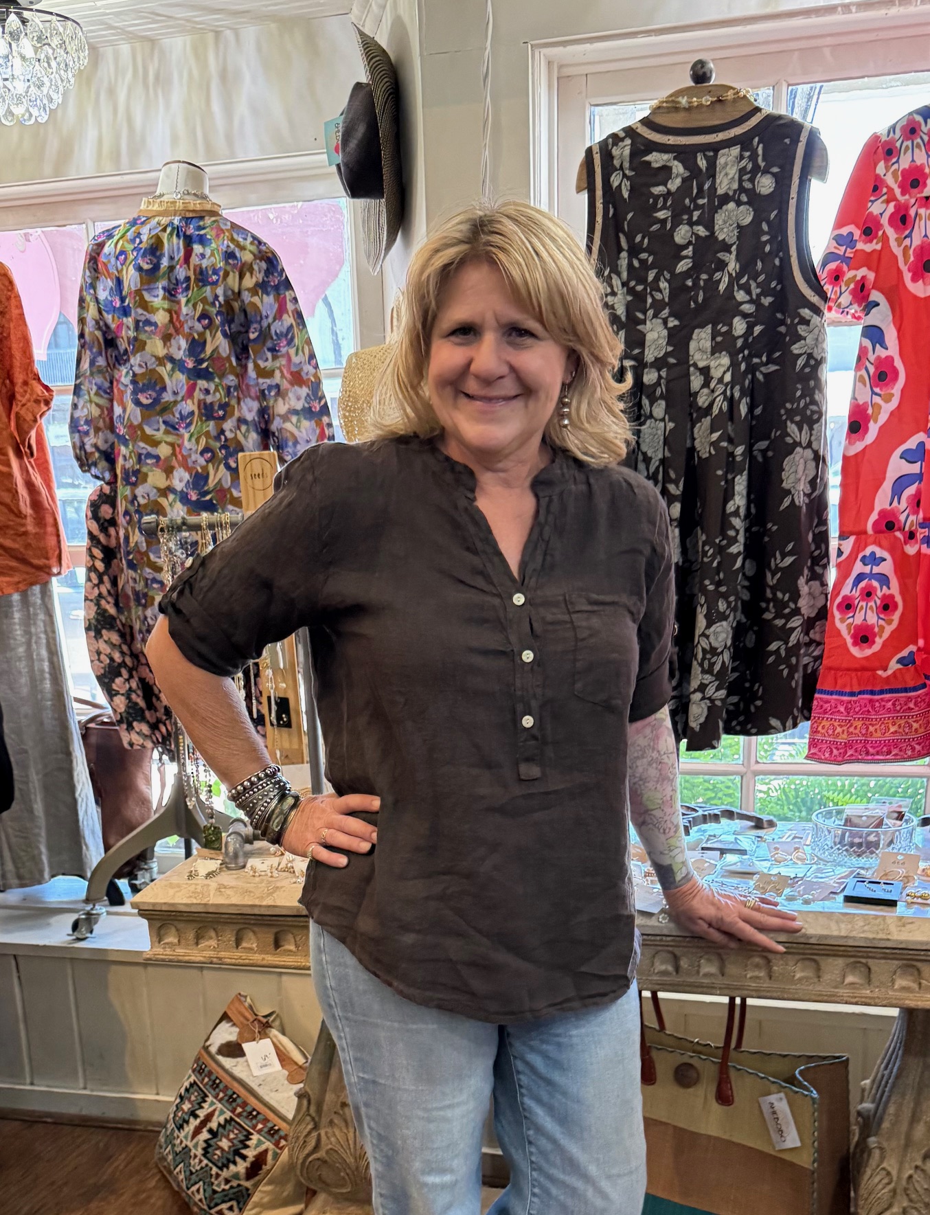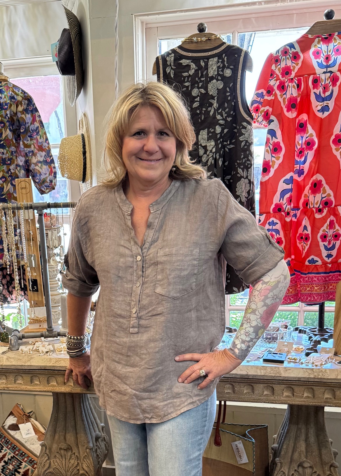 Crafted from premium Italian linen, this solid-color top is the perfect blend of comfort and sophistication. Featuring a flattering V-neckline with a minimalist preacher collar, it offers a modern twist on a timeless silhouette. The 3/4 length sleeves can be worn down or rolled up and secured with a button-tab closure, giving you versatile style options for any occasion. Finished with a single front pocket for a subtle touch of utility, this top is breathable, lightweight, and ideal for warm-weather days or layering year-round.